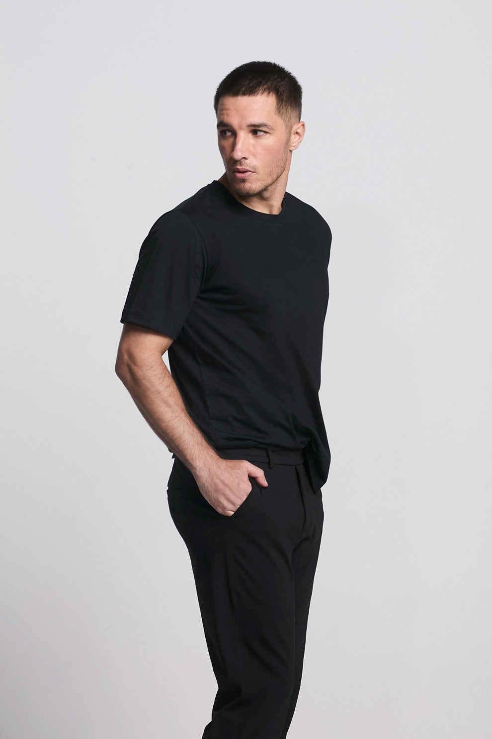 Calça de modelagem reta com corte de alfaiataria. Confeccionada em malha, possui bolsos laterais funcionais e caimento estruturado, que mantém a peça alinhada ao corpo. Detalhe de cós com passantes para cinto.