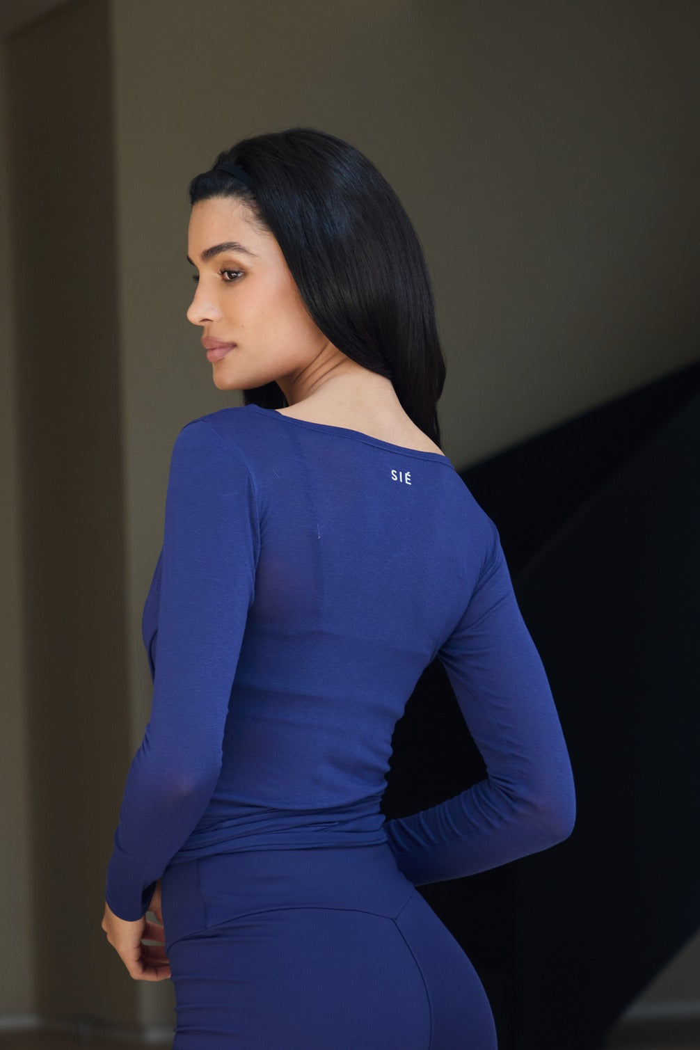 Seu design conta com amarração frontal, permitindo diferentes formas de uso — seja mais ajustado ao corpo ou de maneira solta e descontraída. As mangas longas equilibram o visual, adicionando sofisticação ao modelo. O tom marinho intenso reforça sua atemporalidade, perfeito para compor looks sofisticados tanto em treinos quanto em produções urbanas.
