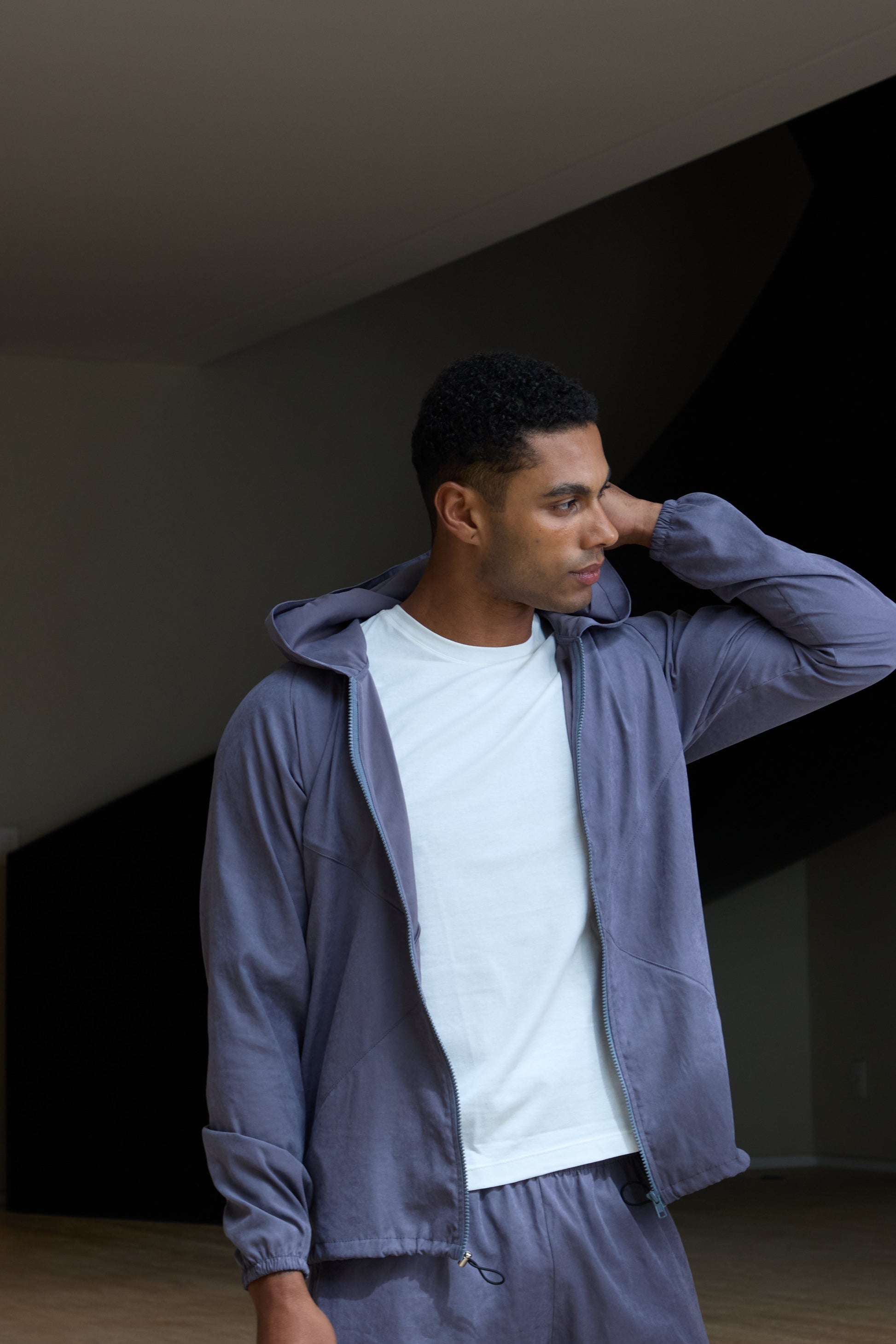 Jaqueta leve com modelagem reta e caimento confortável, confeccionada em tecido de toque macio e acabamento fosco. Possui capuz embutido sem regulagem, fechamento frontal por zíper de ponta a ponta, e recortes diagonais que proporcionam melhor ajuste ao corpo.