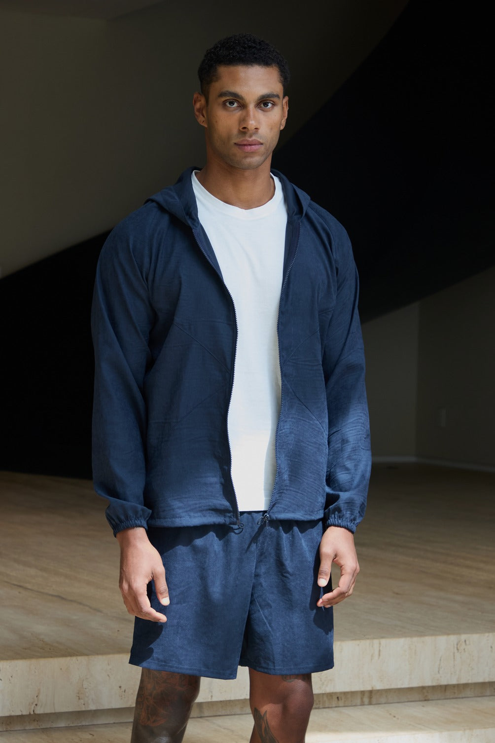 Shorts de comprimento médio confeccionado no mesmo tecido leve e macio com acabamento fosco e caimento solto. A cintura possui cós elástico com cordão regulador, proporcionando ajuste prático e seguro. Conta com bolsos laterais embutidos, garantindo funcionalidade sem perder a linha minimalista.